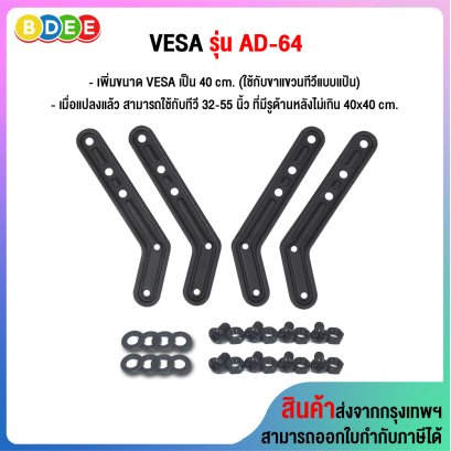 อุปกรณ์เสริม เพิ่มขนาด VASA เป็น 40 ซ.ม. (สามารถใช้กับขาแขวนทีวี BDEE รุ่น WA-30, WA-113 และ S14) ใช้สำหรับแปลงเพลทเดิม (แบบแป้น) ที่มีรู 20x20 ซ.ม. ให้เป็น 20x30 ซ.ม. ,30x30 ซ.ม. ,30x40 ซ.ม. หรือ 40x40 ซ.ม. เหล็กหนา 2 มิลลิเมตร น้ำหนักสินค้า 400 กรัม