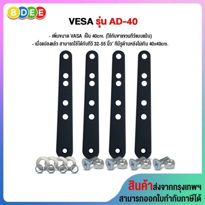 อุปกรณ์เสริม เพิ่มขนาด VESA รุ่น AD-40 เป็นอุปกรณ์เสริมใช้สำหรับแปลงเพลทเดิม (แบบแป้น) ที่มีรู 10x10 ซ.ม. ให้เป็น 10x20 ซ.ม., 10x30 ซ.ม., 20x20 ซ.ม., 20x30 ซ.ม., หรือ 30x30 ซ.ม. ในกรณีเพลทเดิม (แบบแป้น) ที่มีรู 20x20 ซ.ม. ให้เป็น 30x30 ซ.ม., 30x40 ซ.ม. หรือ 40x40 ซ.ม. เหล็กหนา 2 มิลลิเมตร น้ำหนักสินค้า 700 กรัม