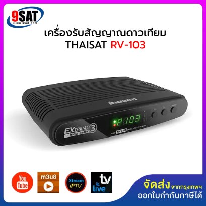รีซีฟเวอร์รุ่นใหม่ล่าสุดจากค่าย Thaisat รุ่น EXTREME3 RV-103 ตัวกล่องเป็นพลาสติก มีช่องระบายความร้อน มีปุ่มสวิทซ์ปิดเปิดอยู่ด้านหลัง รองรับสาย AV และ สาย HDMI รองรับช่องรายการดิจิตอลทีวีครบทุกช่อง ประสิทธิภาพการทำงานสูงสุดด้วย CPU MT M88CS8001 750MHz 32 Bit ให้สีที่สวยงาม นวลตา และความอิ่มตัวของสีที่ชัดเจน