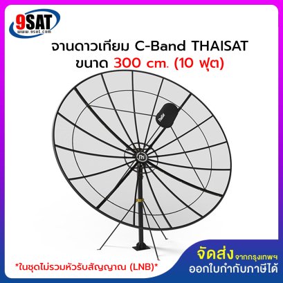 จานดาวเทียม C-Band THAISAT ขนาด 10 ฟุต หรือ 300 ซ.ม. ออกแบบคอจานเป็นแบบวงแหวน โครงจานใหญ่ แข็งแรงกว่า เหมาะสำหรับงานระบบและงานบ้านทั่วไปที่ต้องการความแรงของสัญญาณเป็นพิเศษ เคิร์พจานดีไซน์ออกแบบรูปทรงตามหลัก parabola โดยหน้าจานดีไซน์ใหม่เพิ่มเกณฑ์รับสัญญาณสูงกว่าจานทั่วไปในขนาดเดียวกัน หน้าจานเป็นแบบโปร่ง 4 ชิ้นประกอบ ไม่ต้านลม