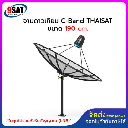 จานดาวเทียม C-Band THAISAT ขนาด 190 ซ.ม. ออกแบบคอจานเป็นแบบวงแหวน โครงจานใหญ่ แข็งแรงกว่า เหมาะสำหรับงานระบบและงานบ้านทั่วไปที่ต้องการความแรงของสัญญาณเป็นพิเศษ เคิร์พจานดีไซน์ออกแบบรูปทรงตามหลัก parabola โดยหน้าจานดีไซน์ใหม่เพิ่มเกณฑ์รับสัญญาณสูงกว่าจานทั่วไปในขนาดเดียวกัน หน้าจานเป็นแบบโปร่ง 4 ชิ้นประกอบ ไม่ต้านลม ประกอบด้วยก้านอลูมิเนียมขนาดใหญ่ 4 ก้าน โครงสร้างหน้าจานผลิตจากอลูมิเนียม หมดปัญหาเรื่องสนิม