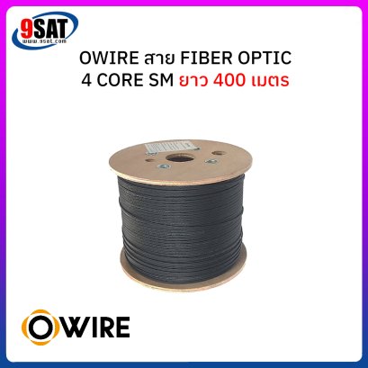 สายไฟเบอร์ออฟติก 4 Core Single-mode (9/125um) FRP, LSZH ยี่ห้อ Owire ยาว 400 เมตร เป็นสาย Fiber Optic สำหรับใช้งานได้ทั้งภายใน และภายนอกอาคาร มีลวดสลิงตลอดแนวสายรองรับแรงดึงที่ระมาณ 45 กิโลกรัม วัสดุเปลือกหุ้ม LSZH เป็นวัสดุที่ไม่ลามไฟและทนต่อสภาวะภายนอกได้อย่างดีเยี่ยม ภายใต้เปลือกหุ้มดังกล่าวจะมี ไฟเบอร์กลาสผสมเรซิ่นอันแข็งแกร่ง (FRP) ขนาบข้างตลอดตามความยาวสาย