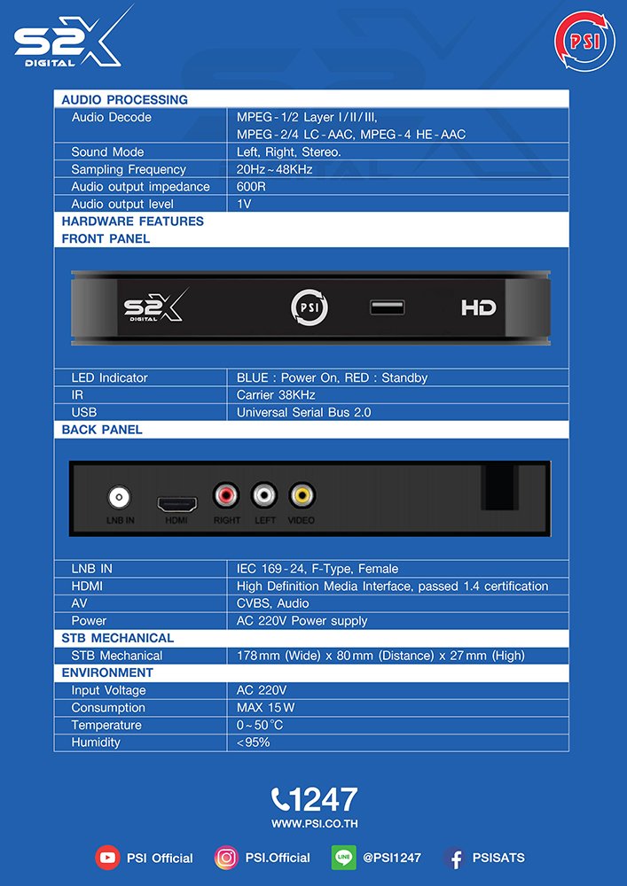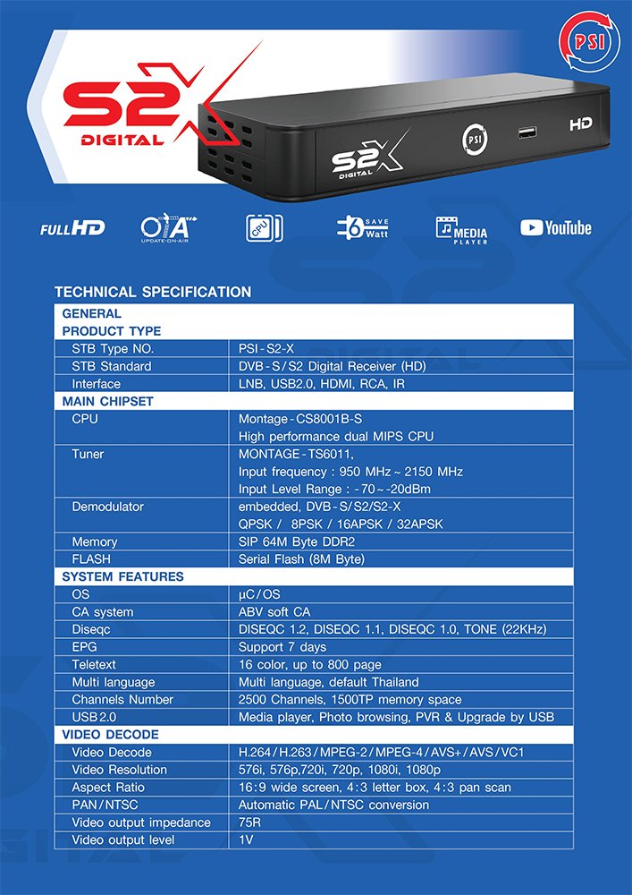 รีซีฟเวอร์ดาวเทียม PSI S2X HD เป็นรีซีฟเวอร์รุ่นใหม่ของทางค่าย PSI ใช้รับสัญญาณในระบบ C-BAND และ KU-Band (จานตระแกรง และจานทึบ) มีช่องรายการที่มีระบบความคมชัดแบบ HD ให้ดูฟรี ๆ แบบไม่มีรายเดือน อนาคตจะมีช่องรายการชั้นนำอื่นๆ มาออกอากาศ ในระบบความคมชัดสูง ให้ชมอีกอย่างต่อเนื่อง และยังมีช่องรายการให้ดูฟรีในระบบ SD อีกกว่า 60 ช่อง ในจานทึบ และอีกกว่า 140 ช่องในจานตระแกรง พร้อมระบบ HOTLINE เพื่อมีปัญหาในการติดตั้งหรือใช้งาน โทรด่วน 1247 CALL CENTER