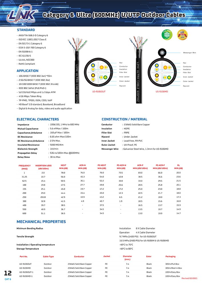 สายแลน LINK US-9106 OUT เป็นสายแลน CAT6 แบบ Ultra/UTP (600MHz) รองรับความเร็วในการรับส่งข้อมูล 10/100/1000 Mbps. สายเป็นสีดำ มีความยาว 305 เมตร (สำหรับใช้ภายนอกอาคาร) วัสดุเปลือกหุ้มสาย 2 ชั้น ปกป้องสายที่อยู่ด้านในได้เป็นอย่างดี ขนาดสายทองแดง 23AWG หรือ 0.58 มิลลิเมตร รองรับการใช้งานในระบบเครือข่ายอินเตอร์เน็ต (LAN) หรือการใช้งานกับกล้องวงจรปิด (CCTV) โดยทำงานควาบคู่กับตัวแปลงสัญญาณภาพและเสียง (BALUN) และรองรับการใช้งานร่วมกับกล้อง IP-Camera โดยใช้ร่วมกับ POE Switch ได้ โดยสายสามารถรองรับความเร็วในระดับ Gigabit ได้เต็มระยะ 100 เมตร และความเร็ว 10 Gigabit ที่ระยะ 55 เมตร