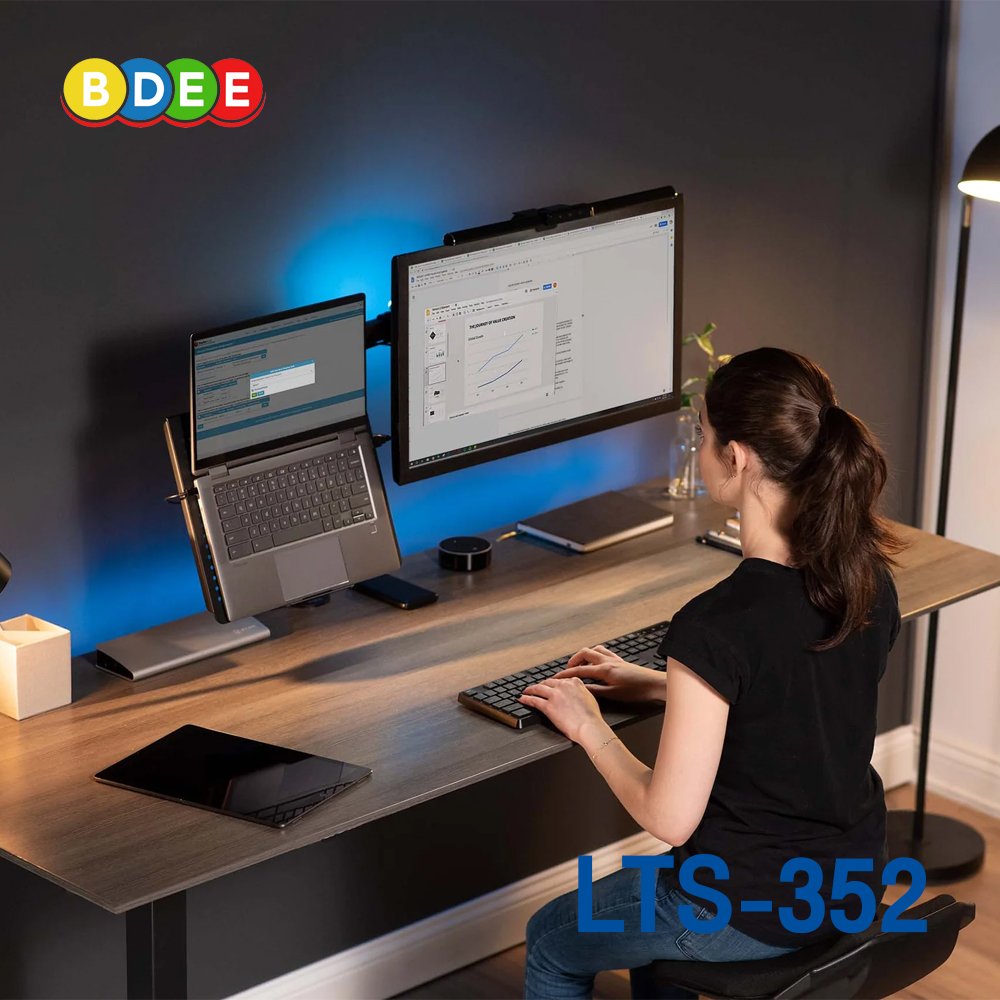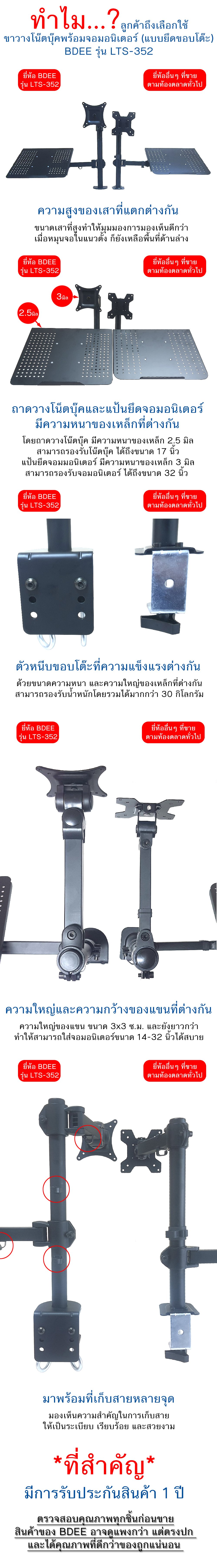 ขาวางโน๊ตบุ๊คพร้อมจอมอนิเตอร์ BDEE รุ่น LTS-352 แบบยึดขอบโต๊ะ ขาวางมี 2 แขน ใช้งานพร้อมกันได้ โดยสามารถวางโน๊ตบุ๊ค ขนาด 10-17 นิ้ว และสามารถติดจอมอนิเตอร์ ตั้งแต่ขนาด 14-27 นิ้วได้ วัสดุเป็นเหล็กพ่นสีอบความร้อนอย่างดี (Powder Coating) สามารถเลื่อนระดับแขนขึ้นลง ส่ายซ้ายขวา ยืดหดได้ รวมถึงปรับก้มเงยได้ รูปทรงสวยงาม งานปราณีต เรียบร้อย ในยามที่ไม่ต้องการใช้ สามารถผลักออกจากพื้นที่โต๊ะทำงานได้ ทำให้เป็นระเบียบ และประหยัดพื้นที่บนโต๊ะทำงาน ทำให้โต๊ะทำงานมีพื้นที่เหลือใช้ทำงานอย่างอื่น
