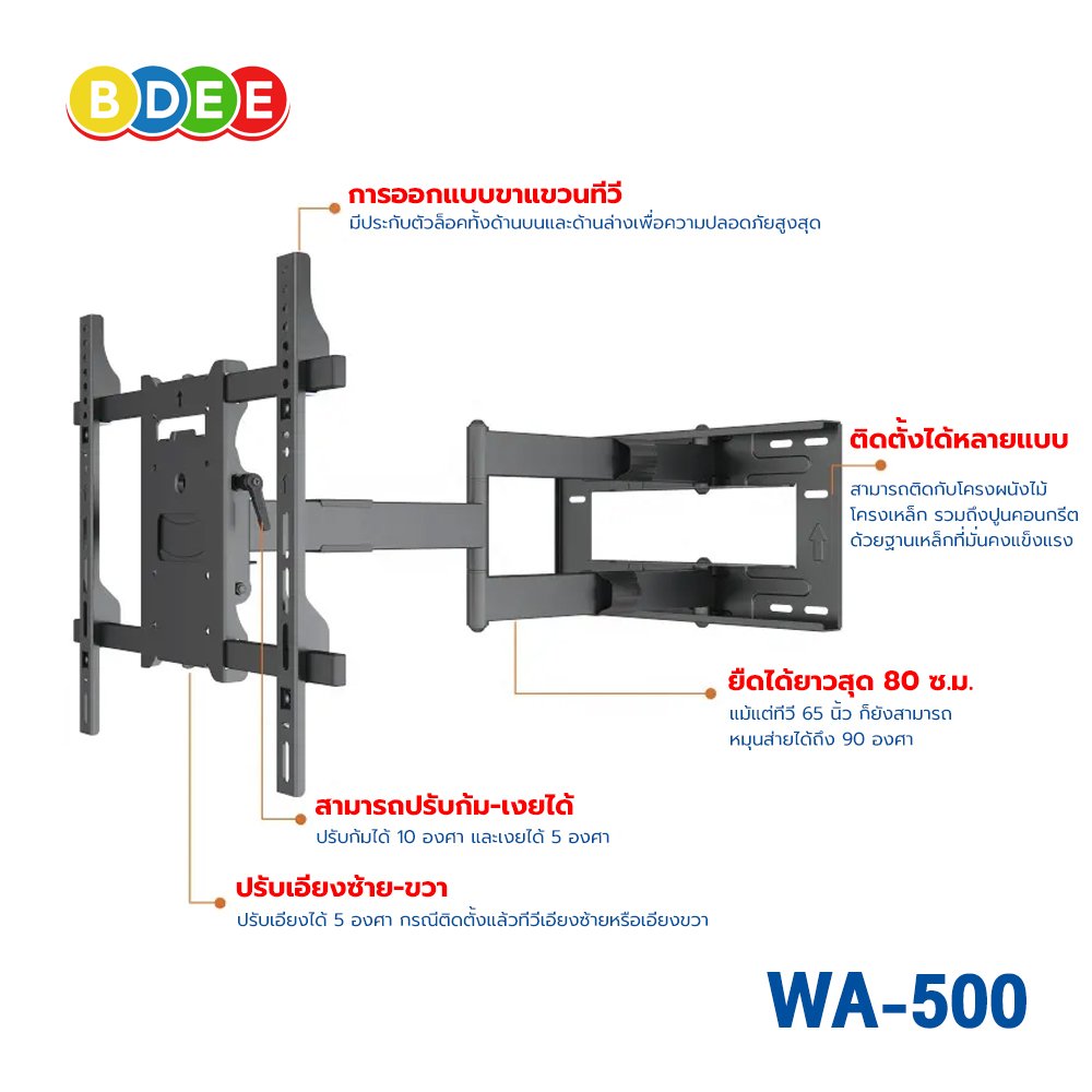 ขาแขวนทีวี BDEE รุ่น WA-500 เหมาะกับทีวีขนาดตั้งแต่ 32-65 นิ้ว และสามารถยืดออกได้ไกลถึง 80 ซ.ม. ดังนั้นแม้แต่ทีวี 65 นิ้ว ก็ยังสามารถหมุนส่ายได้ถึง 90 องศา สามารถปรับส่ายซ้าย-ขวา, ยืดเข้า-ออก และปรับก้มเงยได้ ใช้กับทีวีแบบ OLED, QLED, UHD, Smart TV, LED ได้ทุกรุ่นทุกยี่ห้อ สวยงาม, แข็งแรง ทนทาน เหล็กเคลือบด้วยสีฝุ่นอบความร้อนอย่างดี