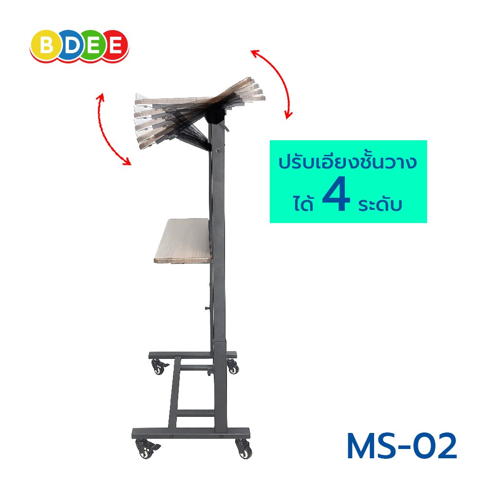 โพเดียมหรือโต๊ะล้อเลื่อนอเนกประสงค์ BDEE รุ่น MS-02 มีล้อเลื่อน 4 ล้อ ล็อคได้ 2 ล้อ มาพร้อมชั้นวาง 2 ชั้น (ชั้นวางด้านบน และชั้นวางด้านล่าง) ชั้นวางผลิตจากไม้ MDF ปิดผิวด้วย PVC ลายไม้อย่างดี สามารถปรับเลื่อนขึ้น-ลงได้ และปรับเอียงได้ 4 ระดับ พร้อมตัวรองกันตก เหมาะสำหรับห้องเรียน ห้องประชุมบริษัทฯ สำนักงานต่างๆ หรืองานพิธีต่างๆ รวมถึงบ้านพักอาศัยทั่วไป โครงสร้างผลิตจากเหล็กพ่นสีอบความร้อนอย่างดี งานปราณีต เรียบร้อย รูปทรงสวยงาม