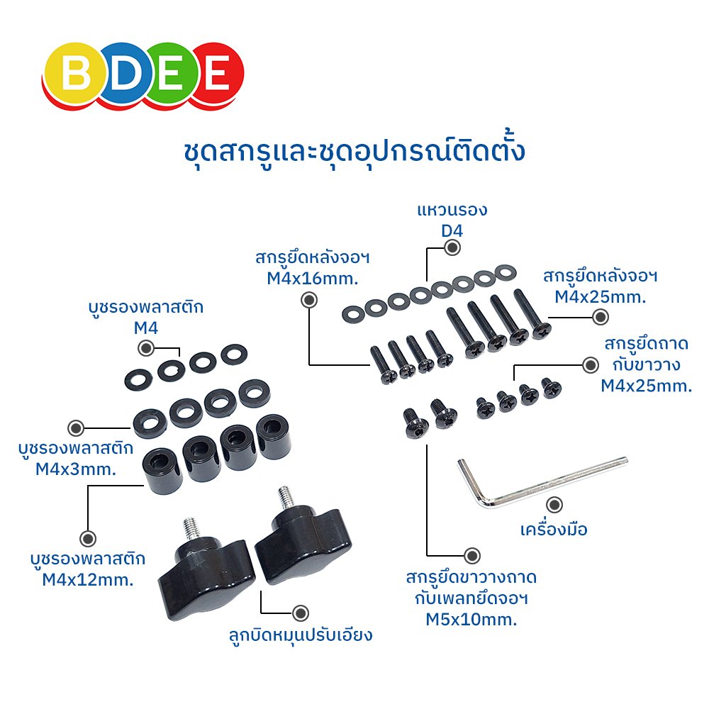 - พร้อมอุปกรณ์ประกอบครบชุด (ตามภาพ) เช่น สกรูยึดหลังจอมอนิเตอร์ให้ทุกรุ่น ทุกยี่ห้อ