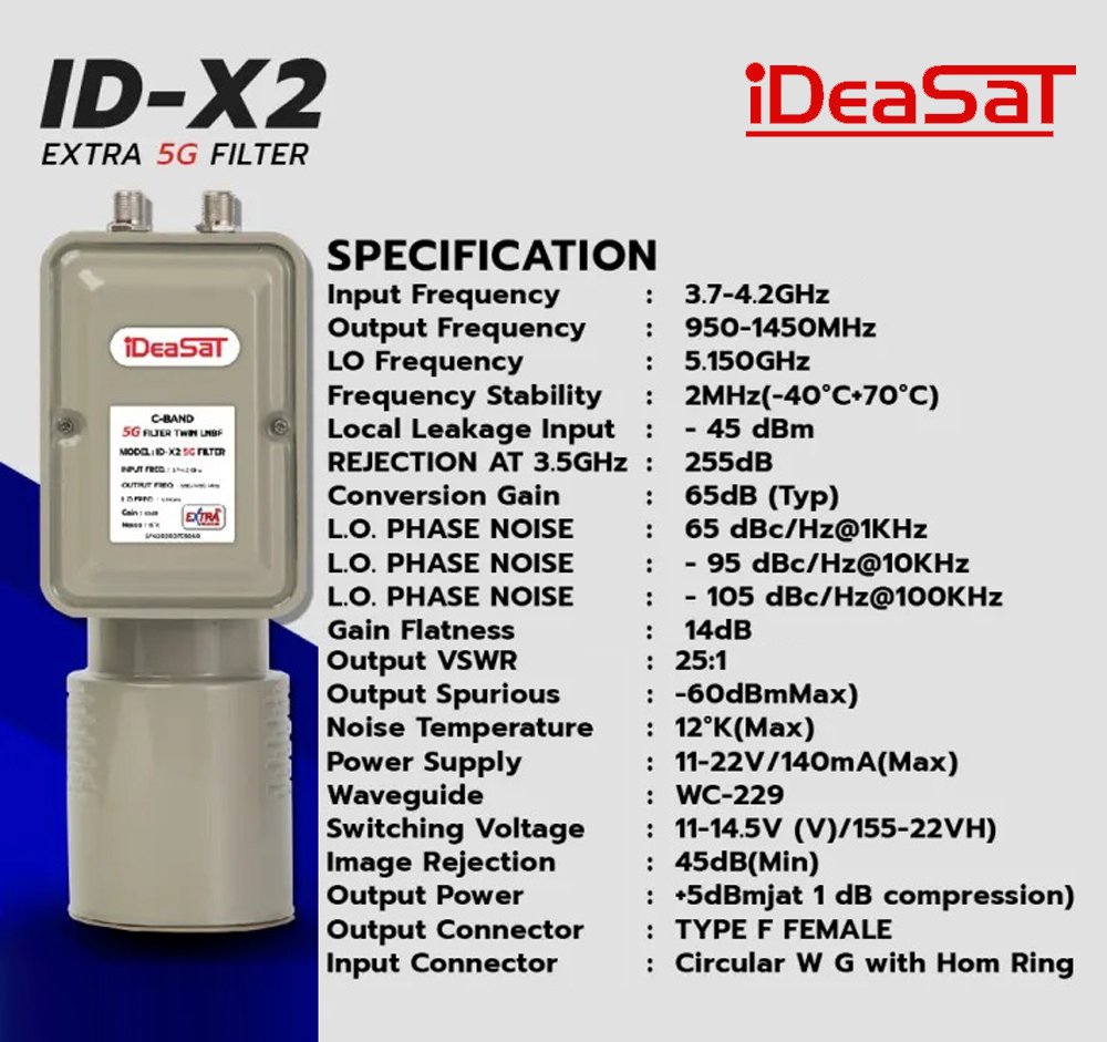 หัวรับสัญญาณจานดาวเทียม (2 ขั้ว) C-Band IDEASAT รุ่น ID-X2 EXTRA 5G FILTER เป็นอุปกรณ์ใช้สำหรับรับสัญญาณจานดาวเทียมแบบขั่วรวม Ver/Hor ในตัว แยก 2 ขั้วอิสระ ใช้กับจานตระแกรงโดยเฉพาะ มีตัวกรองสัญญาณ 5G เพื่อป้องกันสัญญาณรบกวนจากเครือข่ายมือถือ 5G สามารถต่อเข้ากับเครื่องรับสัญญาณโดยตรงได้ 2 จุด หรือสามารถต่อเข้ากับมัลติสวิทซ์เพื่อรับชมได้หลายจุด