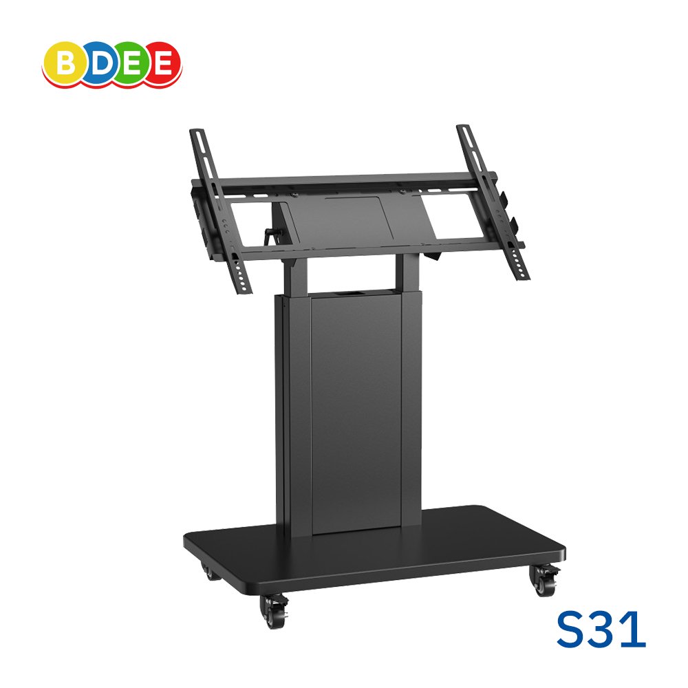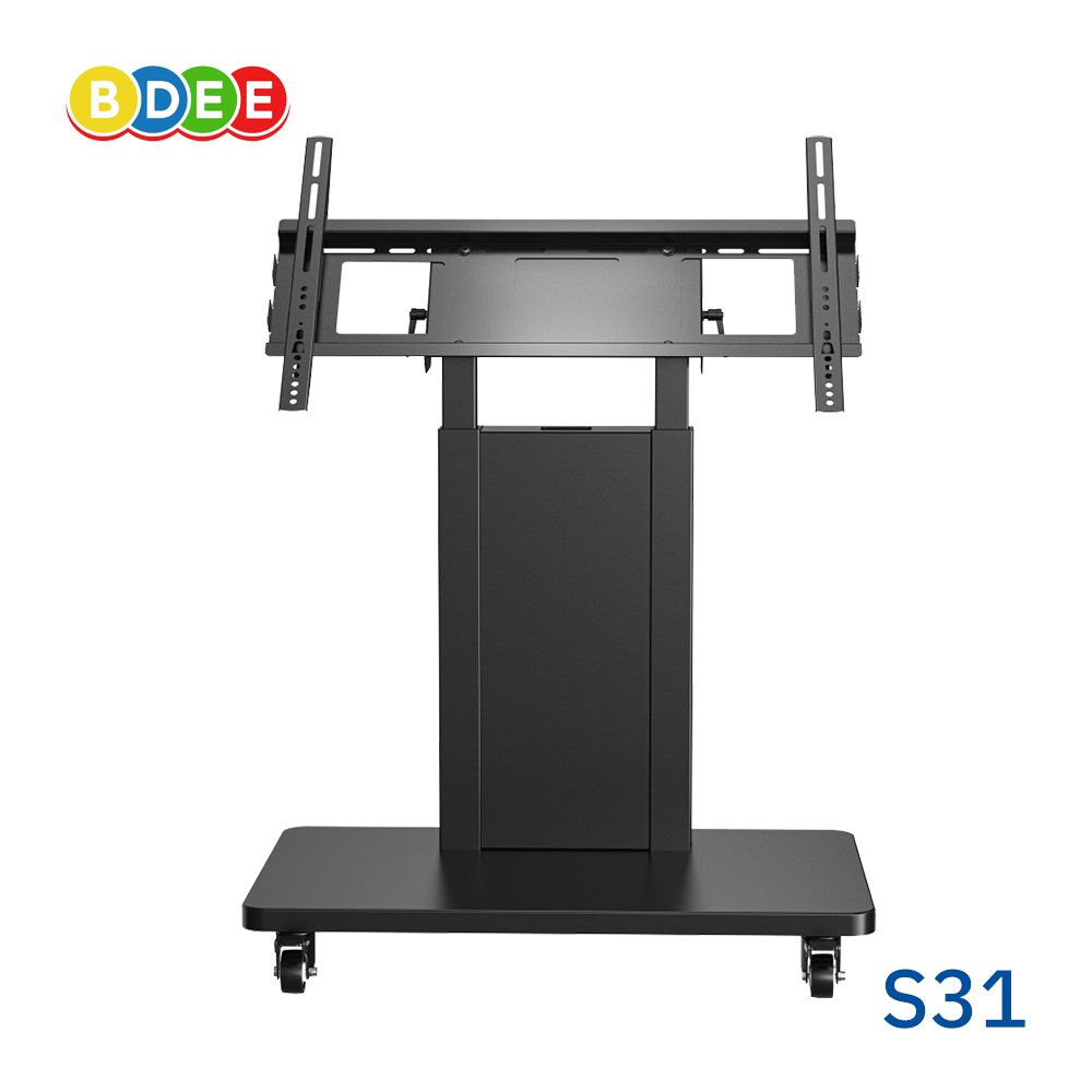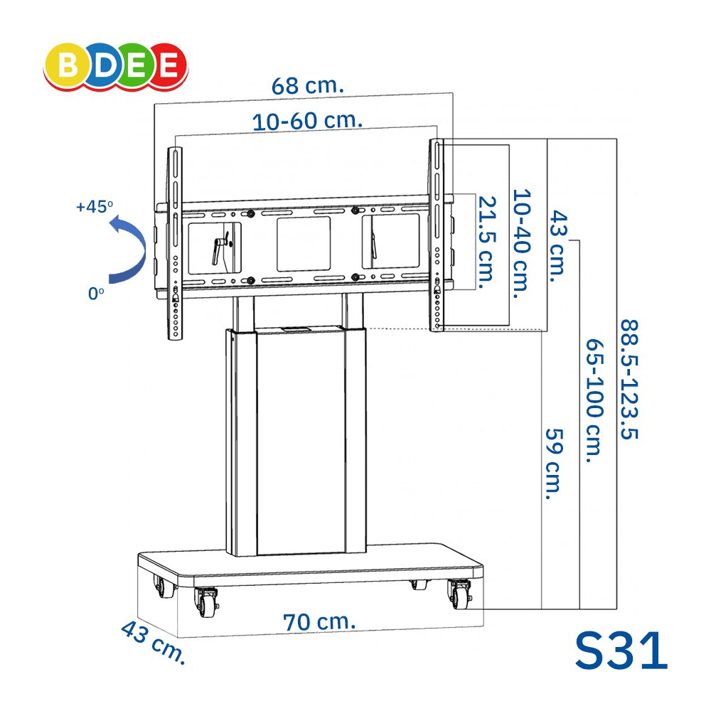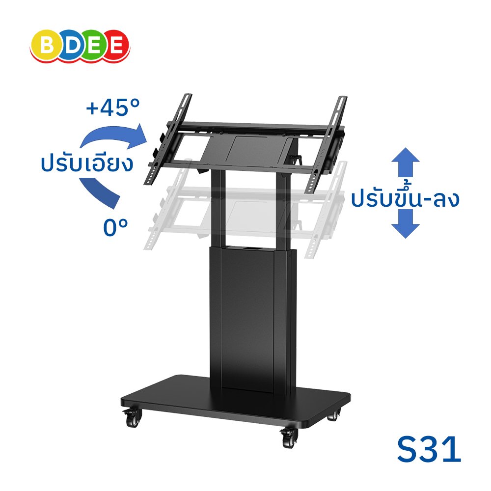 ขาตั้งทีวี BDEE รุ่น S31 เป็นขาตั้งทีวีแบบเตี้ย ปรับเงยหน้าจอได้ 45 องศา, ปรับสูงต่ำได้ ตั้งแต่ 65-100 ซ.ม. เหมาะกับทีวีตั้งแต่ 42-75 นิ้ว ตัวฐานเป็นขาเหล็ก มั่นคง แข็งแรง มีกล่องสำหรับซ่อนปลั๊กไฟและสายไฟ เหมาะสำหรับวางในห้องประชุม ทำให้เวลานั่งดูจอทีวี ภาพจากทีวีจะอยู่ในระดับสายตา ขาตั้งตัวนี้จะช่วยแก้ปัญหานี้ได้ โดยสามารถปรับเงยหน้าจอให้องศาอยู่ในระดับพอดีกับสายตา สินค้ารุ่นนี้เหมาะสำหรับห้องประชุมในโรงเรียน หรือบริษัทฯ ห้างร้าน หรือสำนักงานต่างๆ รวมถึงบ้านพักอาศัยทั่วไป ตัวชิ้นงานผลิตจากเหล็กอย่างดี งานปราณีต เรียบร้อย รูปทรงสวยงาม