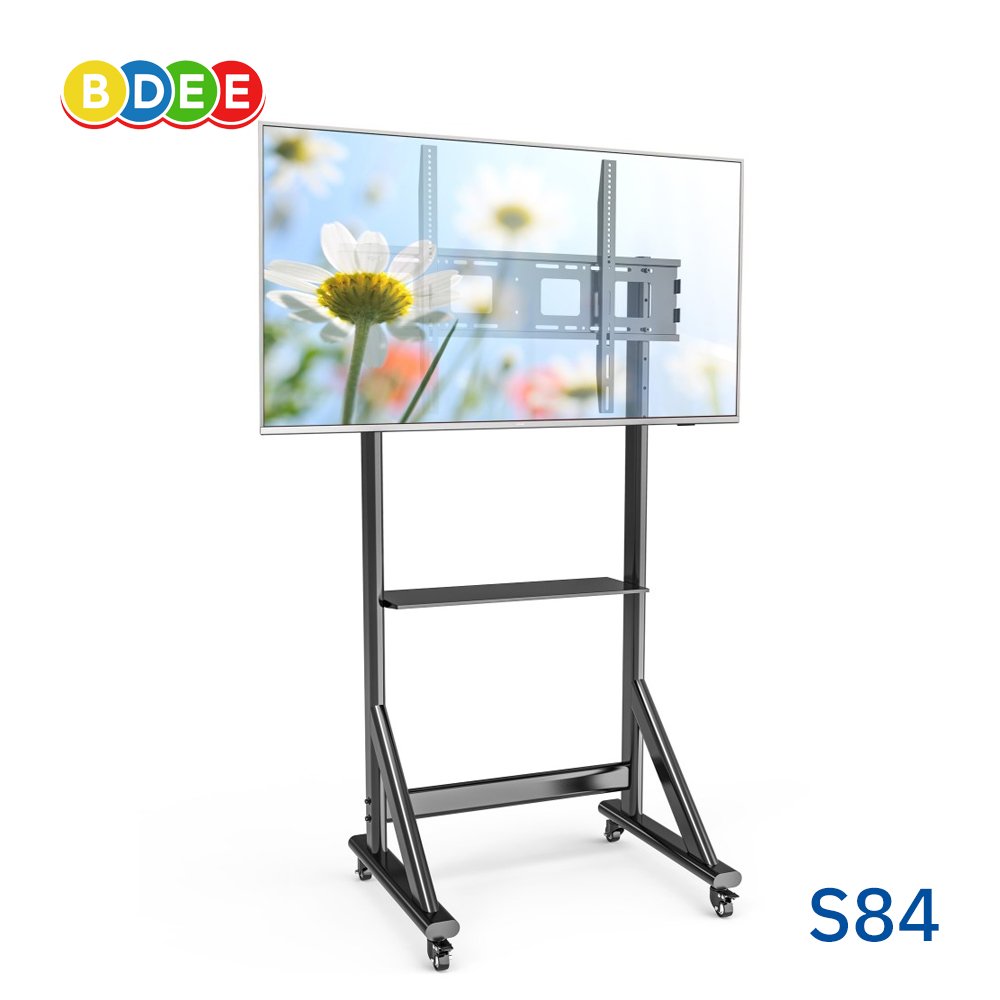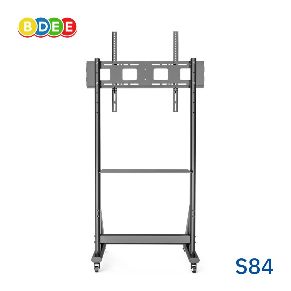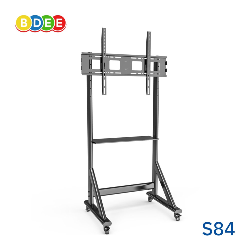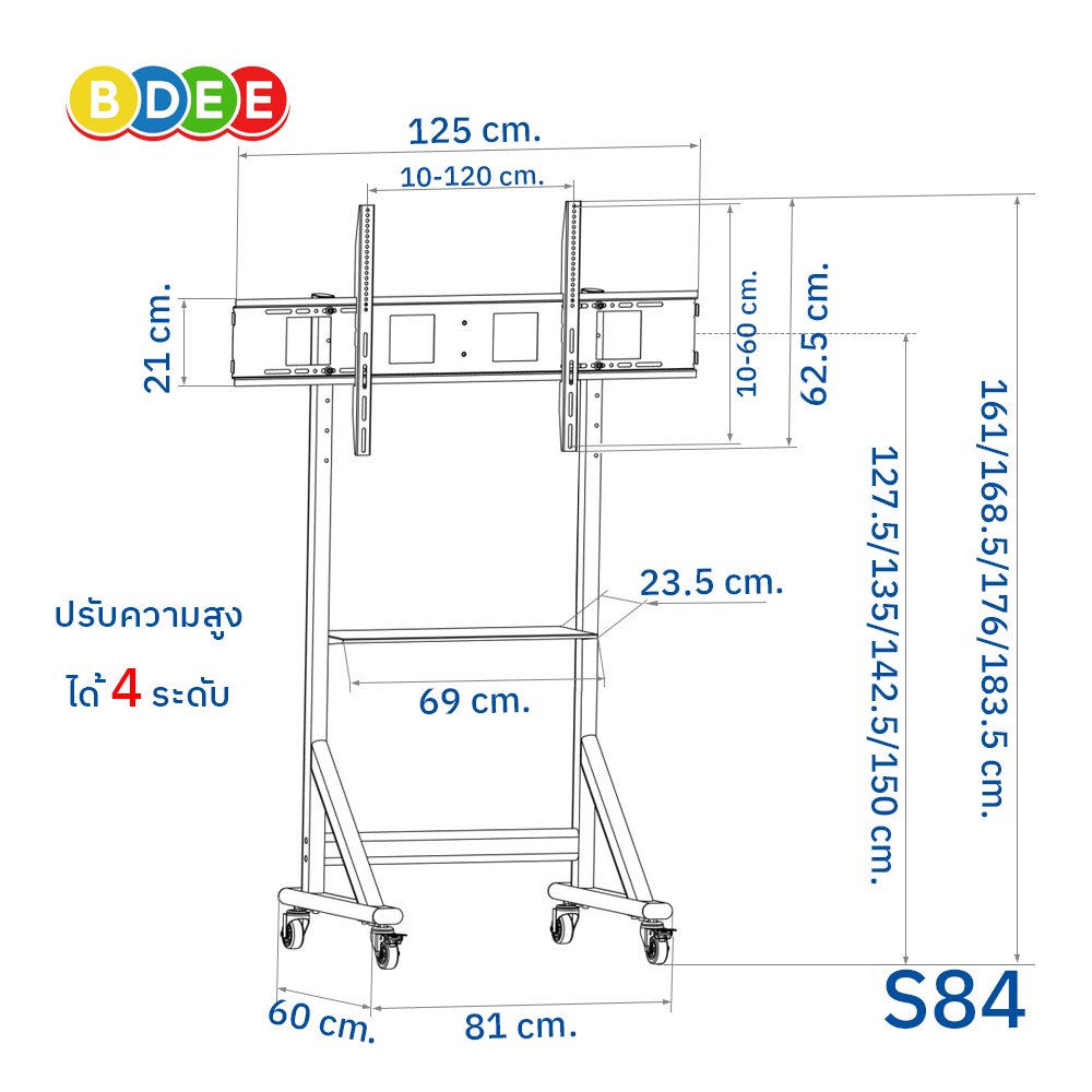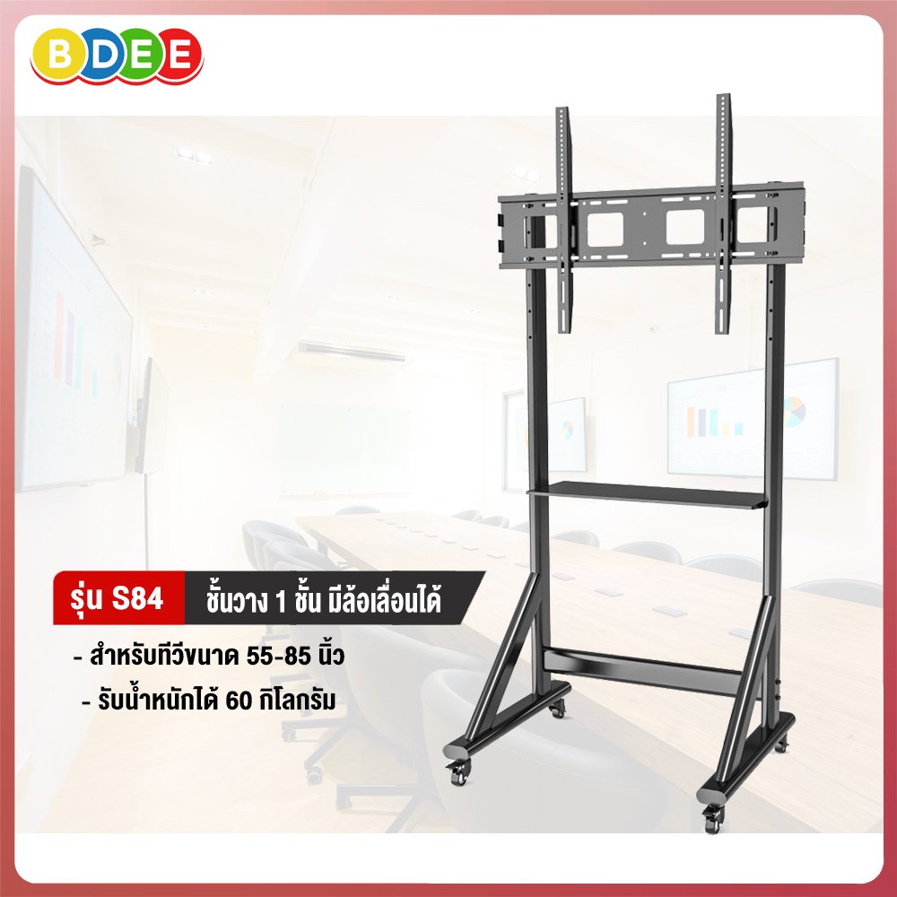 ชุดขาตั้งทีวีแบบเคลื่อนย้ายได้ BDEE รุ่น S83 มีล้อเลื่อน 4 ล้อ (ปรับระดับสูงต่ำได้) มาพร้อมชั้นวาง 1 ชั้น ตัวฐานเป็นเหล็กหนา มั่นคง แข็งแรง รับน้ำหนักได้มาก เหมาะสำหรับห้องเรียน ห้องประชุมบริษัทฯ ห้างร้าน หรือสำนักงานต่างๆ รวมถึงบ้านพักอาศัยทั่วไป ตัวชิ้นงานผลิตจากเหล็กอย่างดี งานปราณีต เรียบร้อย รูปทรงสวยงาม
