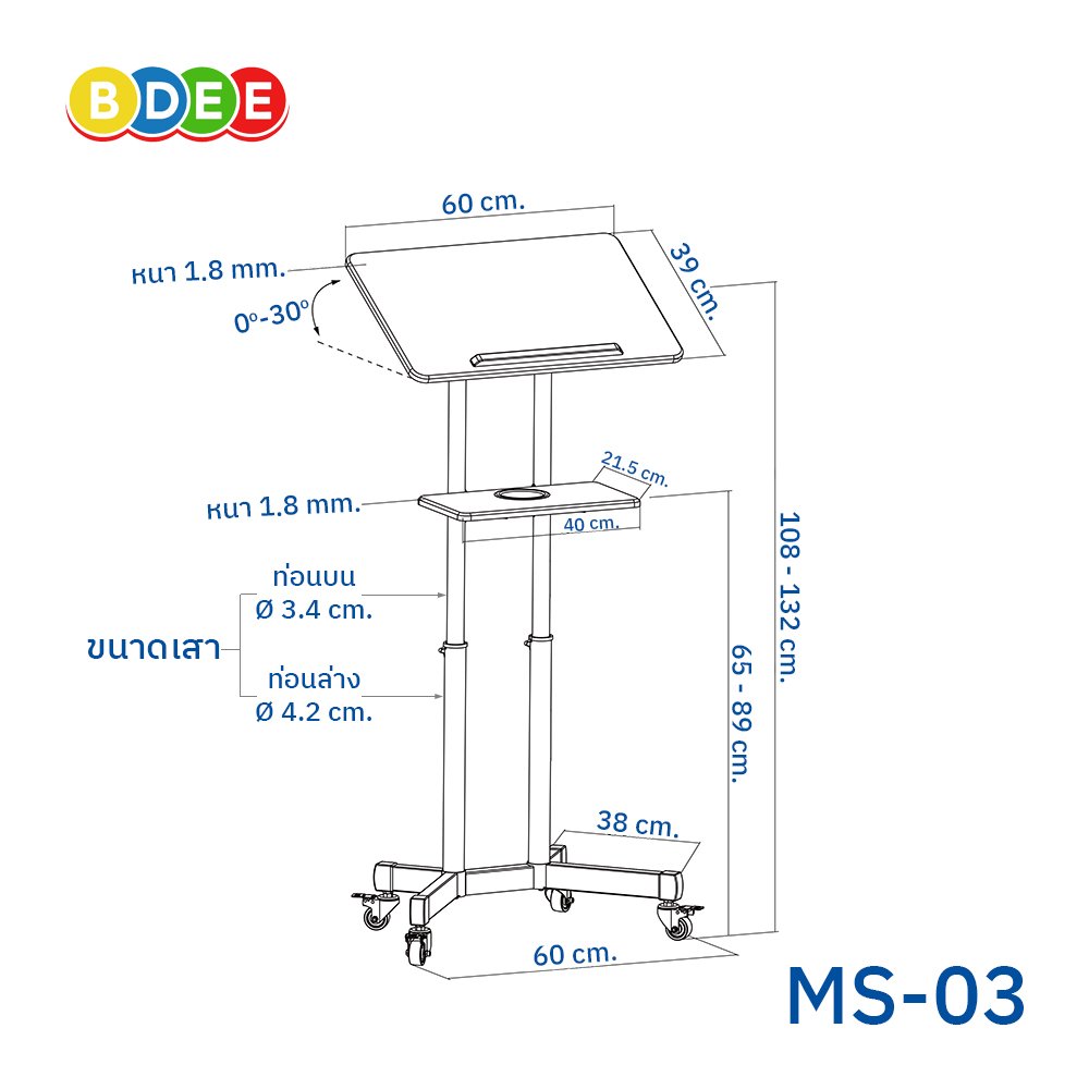 โพเดียมหรือโต๊ะล้อเลื่อนอเนกประสงค์ BDEE รุ่น MS-03 มีล้อเลื่อนล็อคได้ 4 ล้อ มาพร้อมชั้นวาง 2 ชั้น (ชั้นวางด้านบน และชั้นวางด้านล่าง) ชั้นวางด้านล่าง ถ้าไม่ใช้งานสามารถถอดออกได้ เหมาะสำหรับห้องเรียน ห้องประชุมบริษัทฯ หรือสำนักงานต่างๆ รวมถึงบ้านพักอาศัยทั่วไป ตัวชิ้นงานผลิตจากเหล็กอย่างดี งานปราณีต เรียบร้อย รูปทรงสวยงาม
